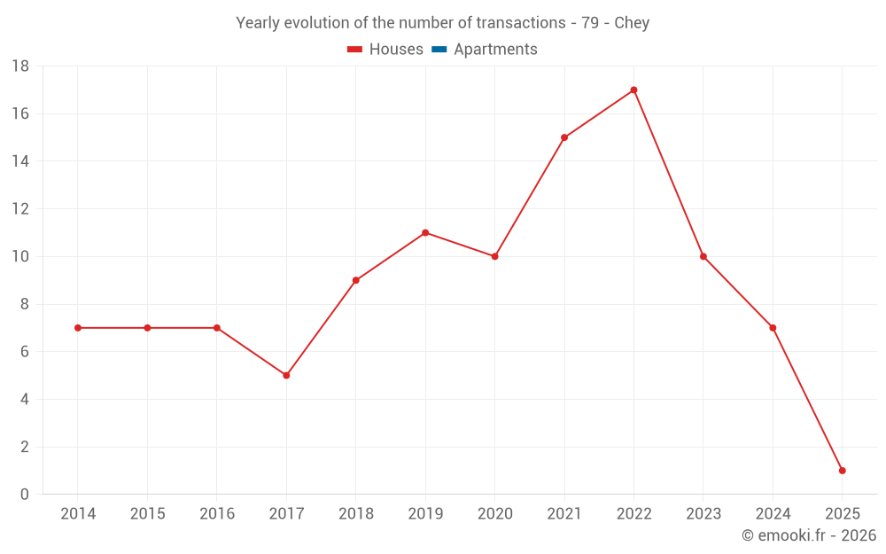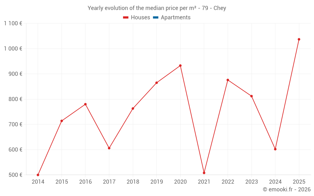 The median price on the 14 house transactions of the last 24 months in the municipality of Chey was 854 € per square meter for a median property value of 84 818 €. Over this period, 60% of transactions were between 418 and 1 122 € per square meter (from the 2nd to the 8th deciles).