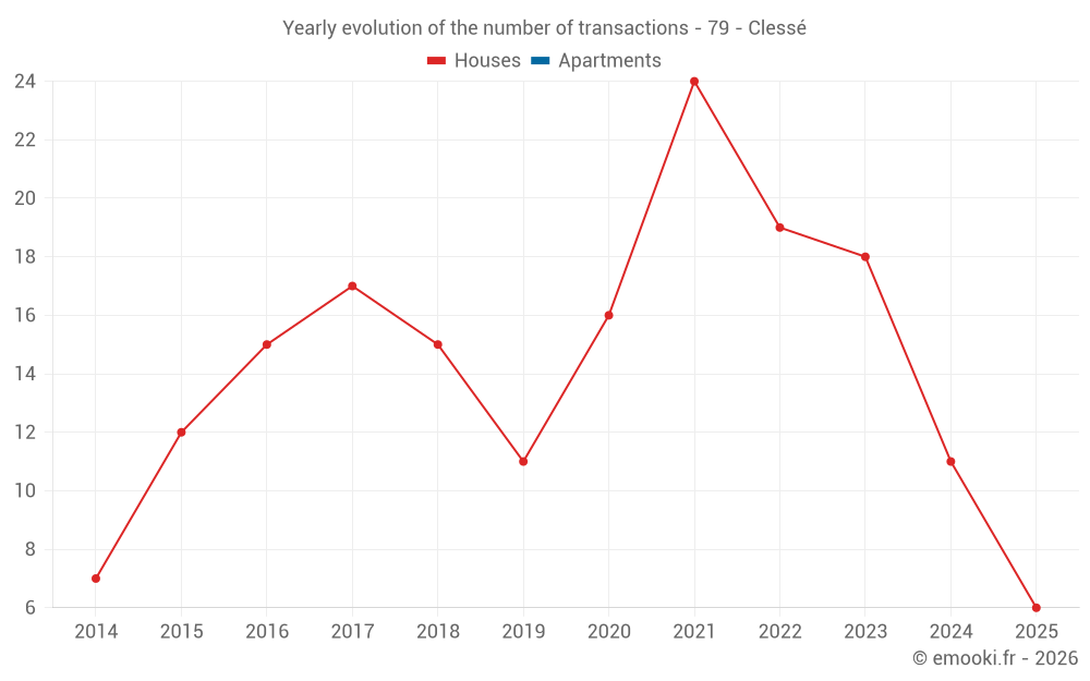 The median price on the 26 house transactions of the last 24 months in the municipality of Clessé was 960 € per square meter for a median property value of 98 530 €. Over this period, 60% of transactions were between 529 and 1 300 € per square meter (from the 2nd to the 8th deciles).
