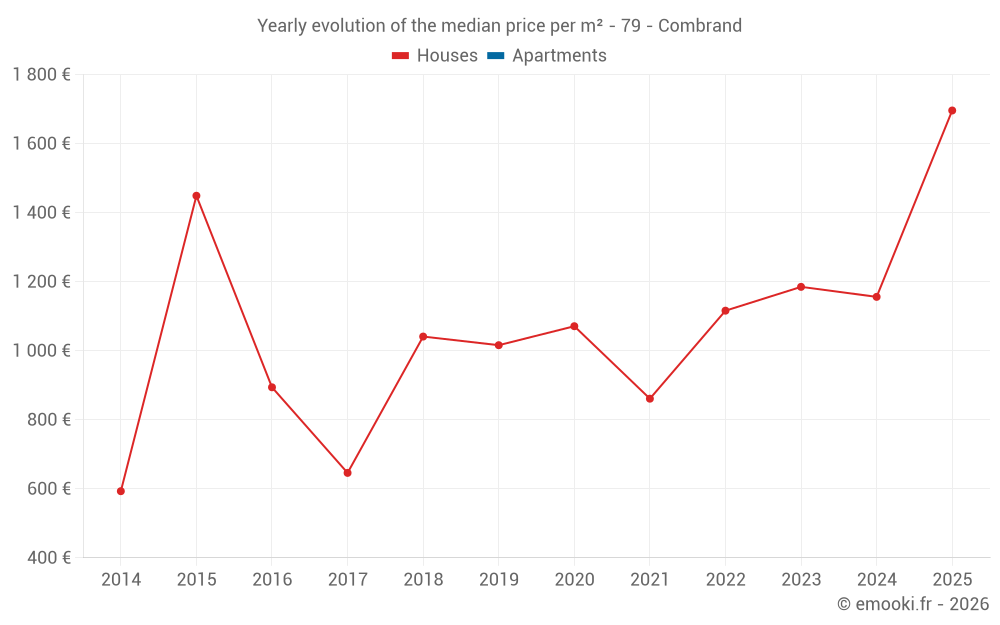 The median price on the 29 house transactions of the last 24 months in the municipality of Combrand was 1 275 € per square meter for a median property value of 130 000 €. Over this period, 60% of transactions were between 770 and 1 615 € per square meter (from the 2nd to the 8th deciles).