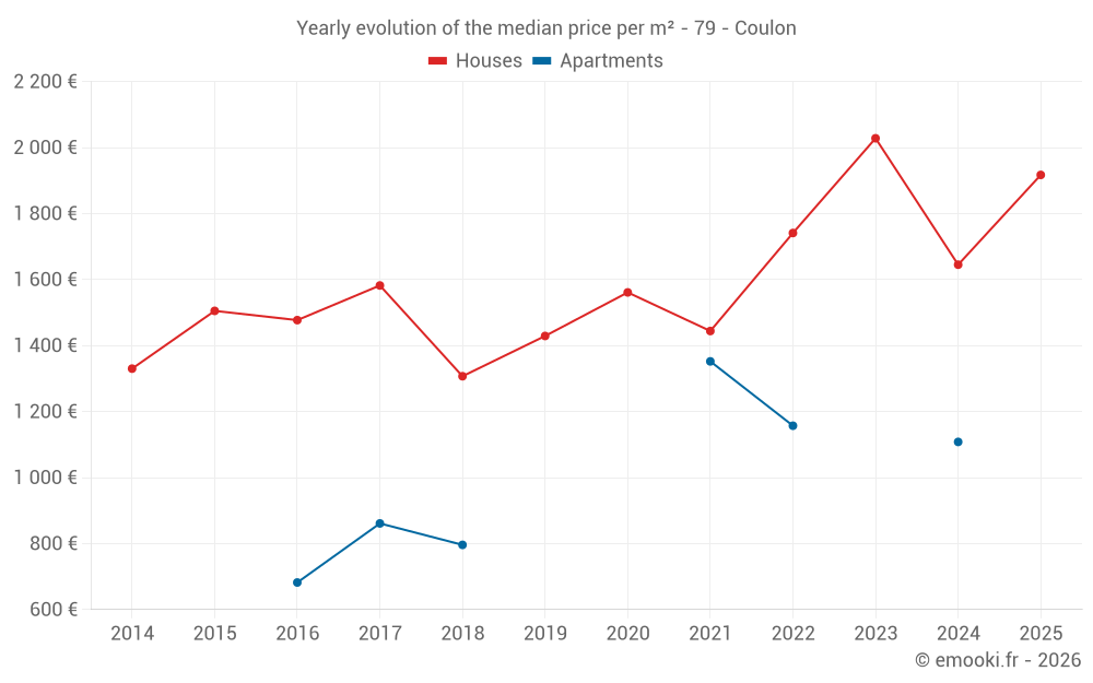 The median price on the 30 house transactions of the last 12 months in the municipality of Coulon was 1 728 € per square meter for a median property value of 170 500 €. Over this period, 60% of transactions were between 1 227 and 2 324 € per square meter (from the 2nd to the 8th deciles).