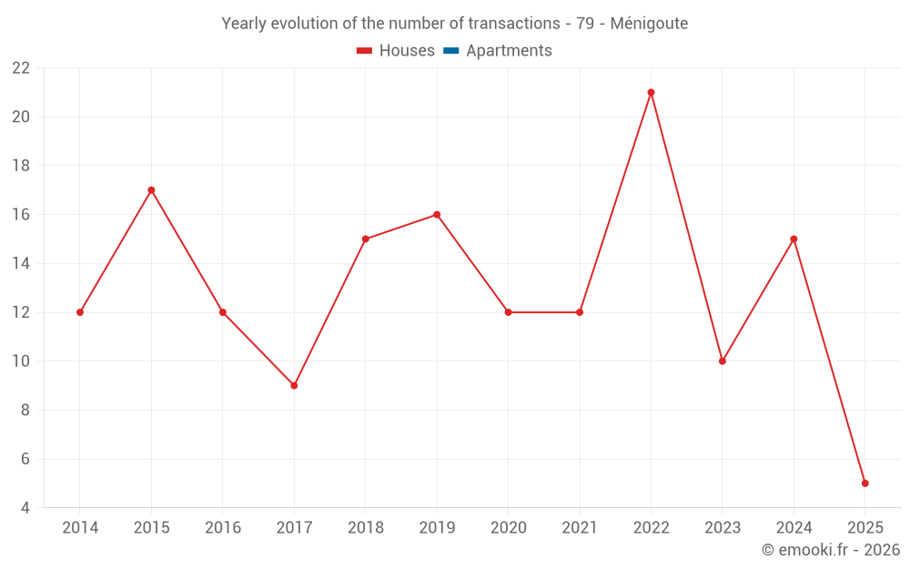 The median price on the 17 house transactions of the last 12 months in the municipality of Ménigoute was 921 € per square meter for a median property value of 115 000 €. Over this period, 60% of transactions were between 821 and 1 142 € per square meter (from the 2nd to the 8th deciles).