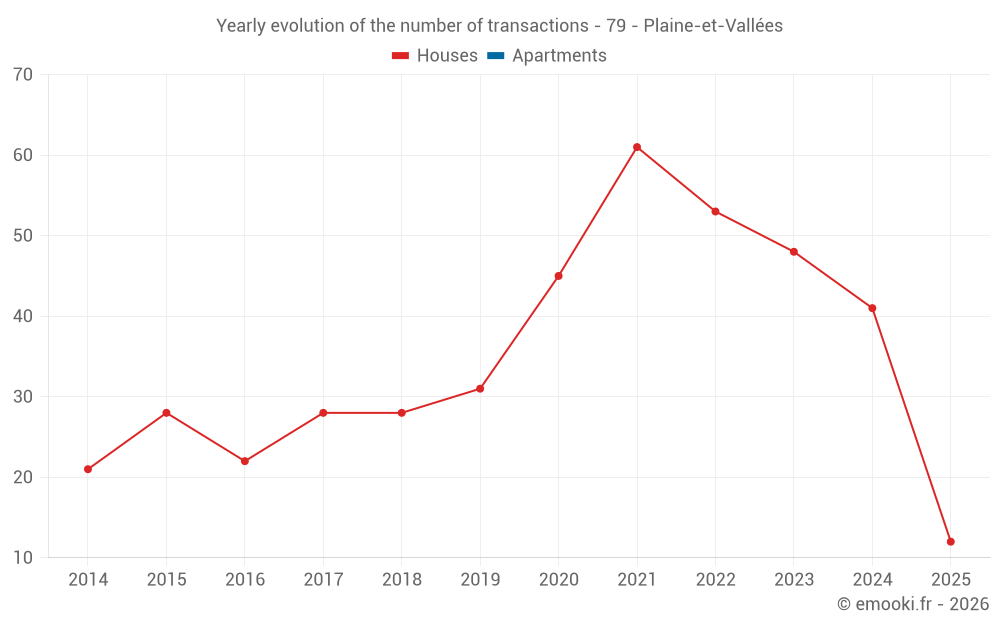 The median price on the 39 house transactions of the last 12 months in the municipality of Plaine-et-Vallées was 808 € per square meter for a median property value of 72 000 €. Over this period, 60% of transactions were between 599 and 1 461 € per square meter (from the 2nd to the 8th deciles).