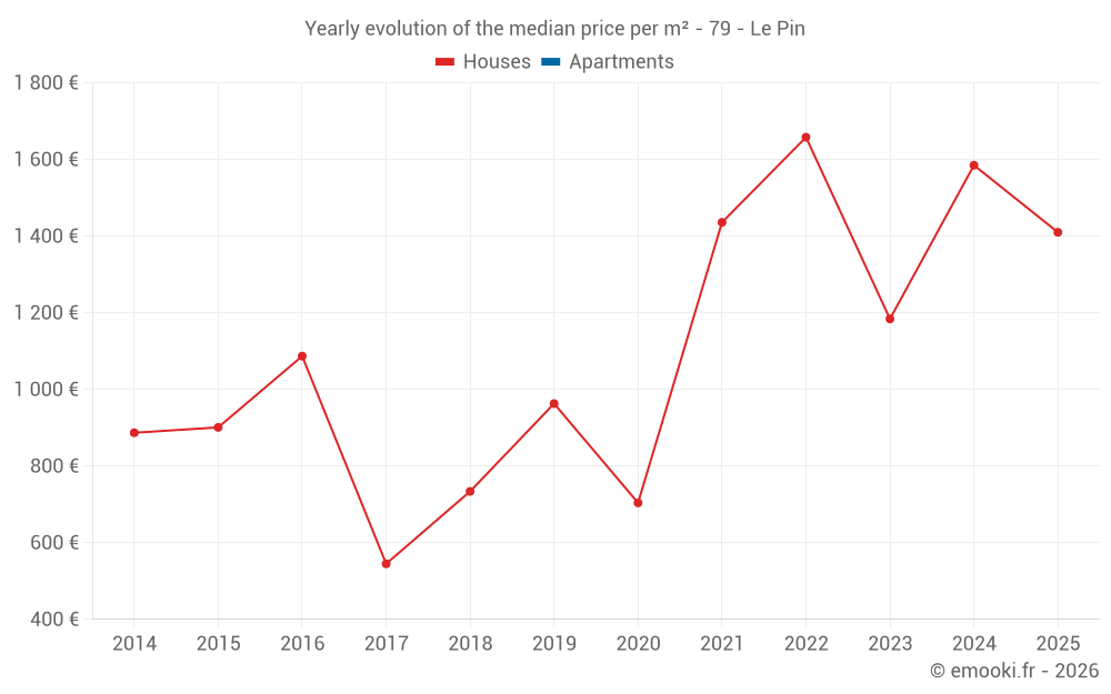 The median price on the 19 house transactions of the last 24 months in the municipality of Le Pin was 1 231 € per square meter for a median property value of 130 000 €. Over this period, 60% of transactions were between 562 and 1 908 € per square meter (from the 2nd to the 8th deciles).