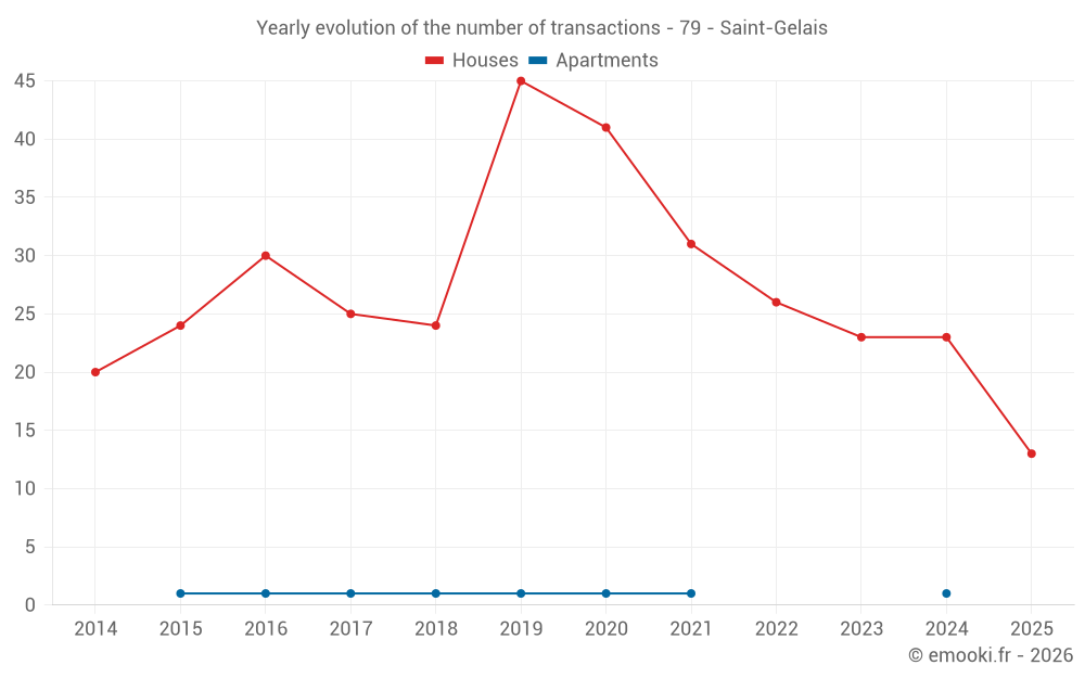 The median price on the 25 house transactions of the last 12 months in the municipality of Saint-Gelais was 1 910 € per square meter for a median property value of 235 000 €. Over this period, 60% of transactions were between 1 354 and 2 299 € per square meter (from the 2nd to the 8th deciles).
