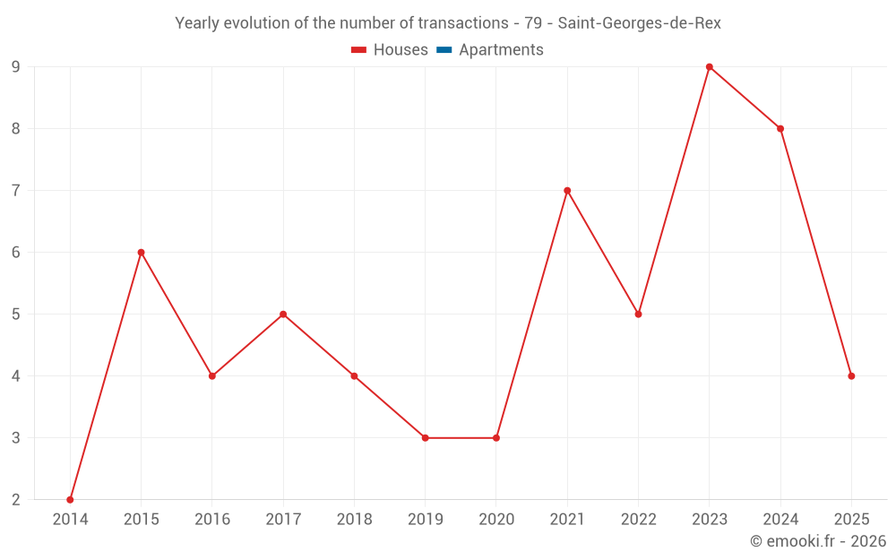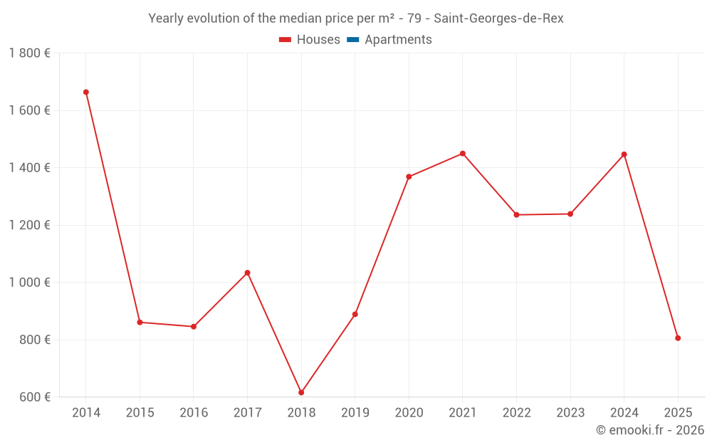 The median price on the 16 house transactions of the last 24 months in the municipality of Saint-Georges-de-Rex was 1 058 € per square meter for a median property value of 78 144 €. Over this period, 60% of transactions were between 597 and 1 505 € per square meter (from the 2nd to the 8th deciles).