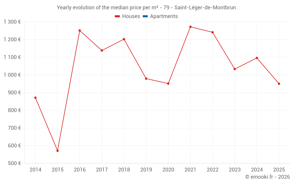 The median price on the 27 house transactions of the last 24 months in the municipality of Saint-Léger-de-Montbrun was 1 063 € per square meter for a median property value of 135 000 €. Over this period, 60% of transactions were between 573 and 1 579 € per square meter (from the 2nd to the 8th deciles).
