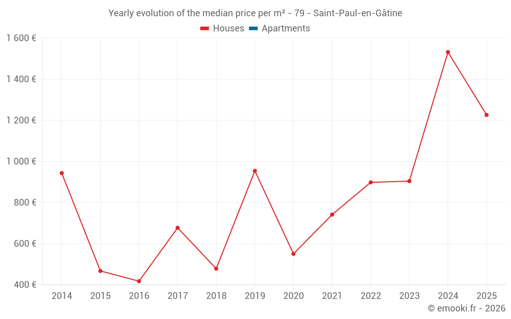 The median price on the 15 house transactions of the last 24 months in the municipality of Saint-Paul-en-Gâtine was 1 192 € per square meter for a median property value of 129 920 €. Over this period, 60% of transactions were between 758 and 1 548 € per square meter (from the 2nd to the 8th deciles).