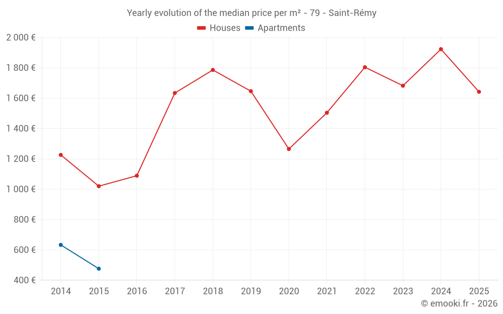 The median price on the 20 house transactions of the last 24 months in the municipality of Saint-Rémy was 1 710 € per square meter for a median property value of 183 000 €. Over this period, 60% of transactions were between 1 358 and 2 346 € per square meter (from the 2nd to the 8th deciles).