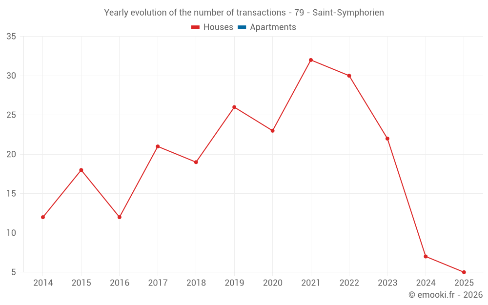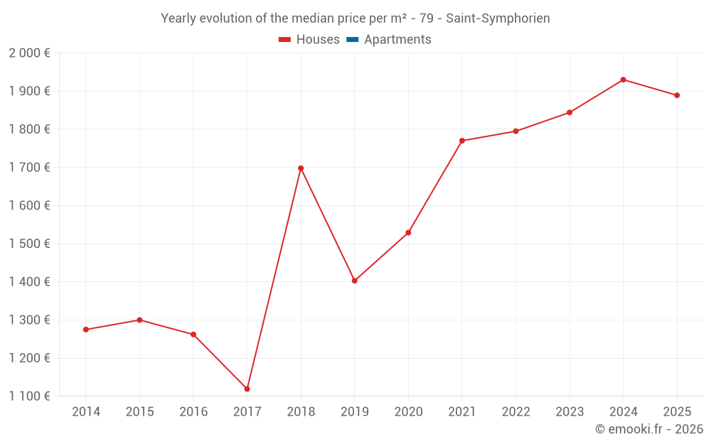 The median price on the 24 house transactions of the last 24 months in the municipality of Saint-Symphorien was 1 840 € per square meter for a median property value of 165 786 €. Over this period, 60% of transactions were between 1 465 and 2 412 € per square meter (from the 2nd to the 8th deciles).