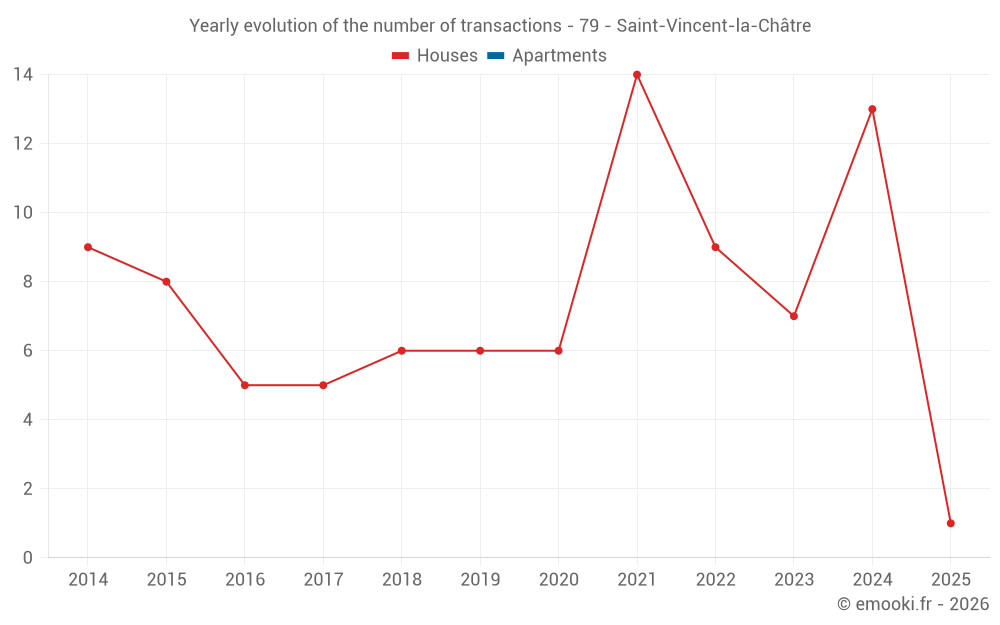 The median price on the 17 house transactions of the last 24 months in the municipality of Saint-Vincent-la-Châtre was 906 € per square meter for a median property value of 90 000 €. Over this period, 60% of transactions were between 491 and 1 356 € per square meter (from the 2nd to the 8th deciles).