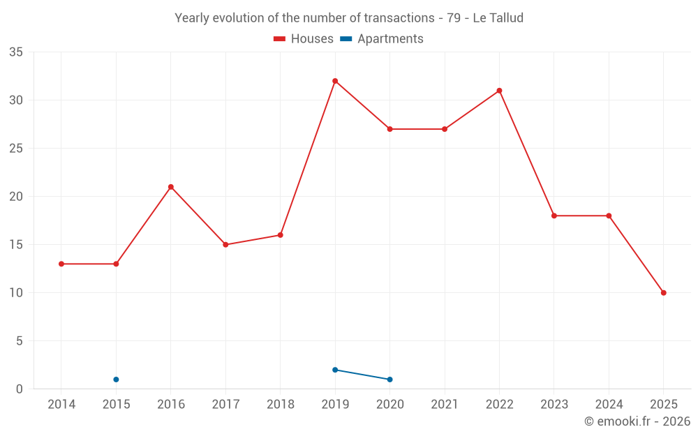 The median price on the 20 house transactions of the last 12 months in the municipality of Le Tallud was 1 624 € per square meter for a median property value of 156 000 €. Over this period, 60% of transactions were between 906 and 1 754 € per square meter (from the 2nd to the 8th deciles).