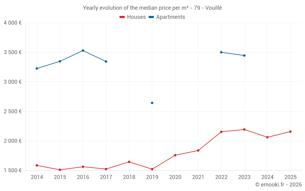 The median price on the 34 house transactions of the last 12 months in the municipality of Vouillé was 2 218 € per square meter for a median property value of 226 400 €. Over this period, 60% of transactions were between 1 636 and 2 475 € per square meter (from the 2nd to the 8th deciles).