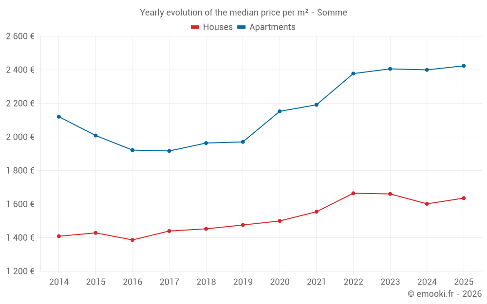 The median price on the 900 house transactions of the last 3 months in the Somme department was 1 610 € per square meter for a median property value of 145 000 €. Over this period, 60% of transactions were between 961 and 2 417 € per square meter (from the 2nd to the 8th deciles).