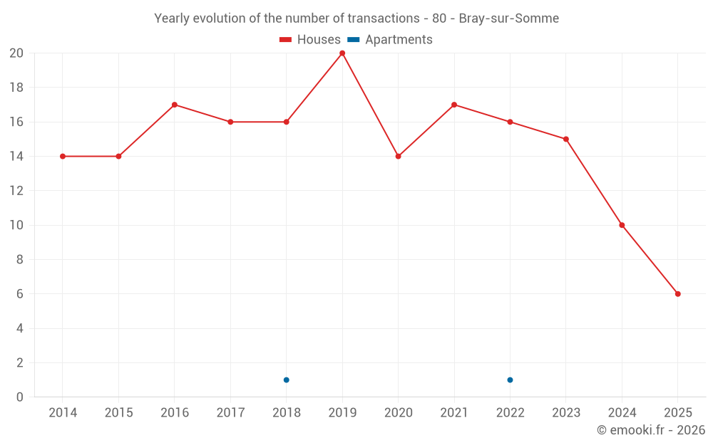 The median price on the 23 house transactions of the last 24 months in the municipality of Bray-sur-Somme was 1 135 € per square meter for a median property value of 108 000 €. Over this period, 60% of transactions were between 650 and 1 692 € per square meter (from the 2nd to the 8th deciles).
