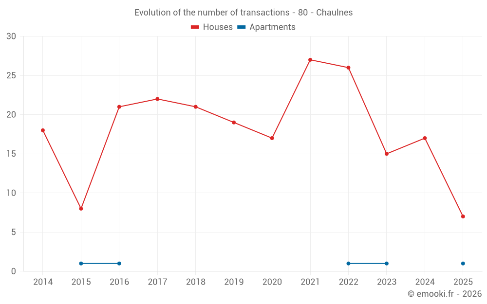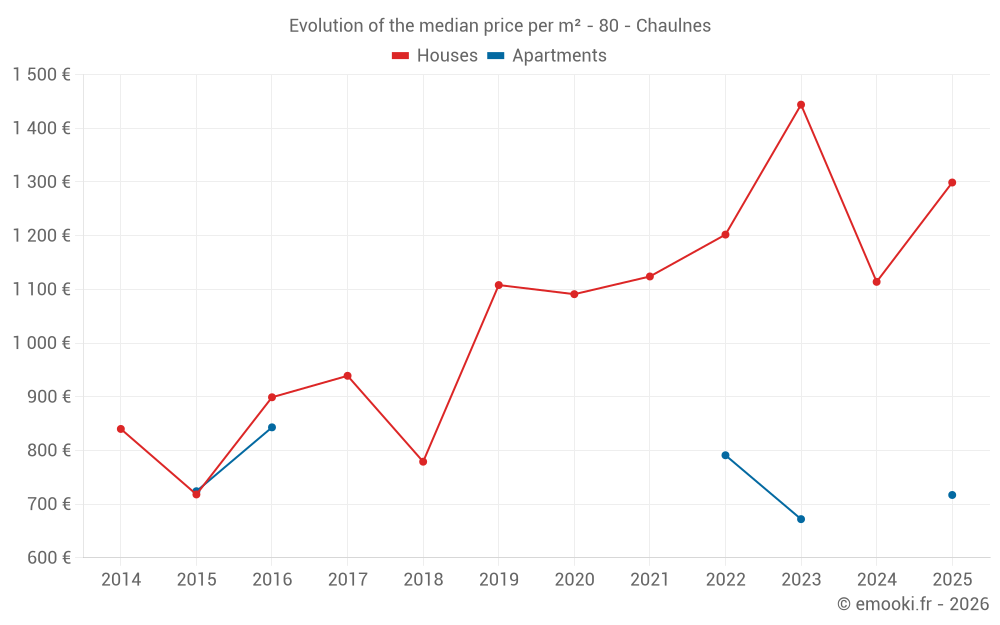 The median price on the 19 house transactions of the last 12 months in the municipality of Chaulnes was 1 114 € per square meter for a median property value of 105 000 €. Over this period, 60% of transactions were between 880 and 1 495 € per square meter (from the 2nd to the 8th deciles).