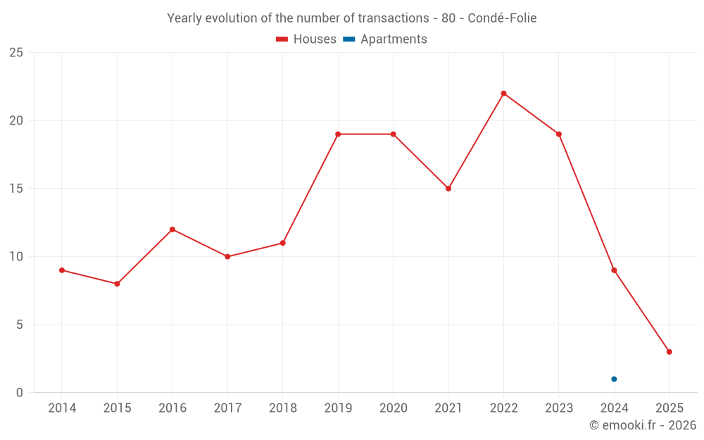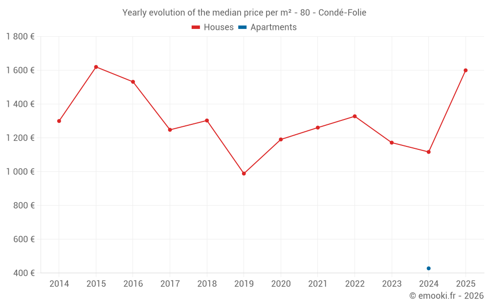 The median price on the 22 house transactions of the last 24 months in the municipality of Condé-Folie was 1 144 € per square meter for a median property value of 114 500 €. Over this period, 60% of transactions were between 707 and 1 704 € per square meter (from the 2nd to the 8th deciles).