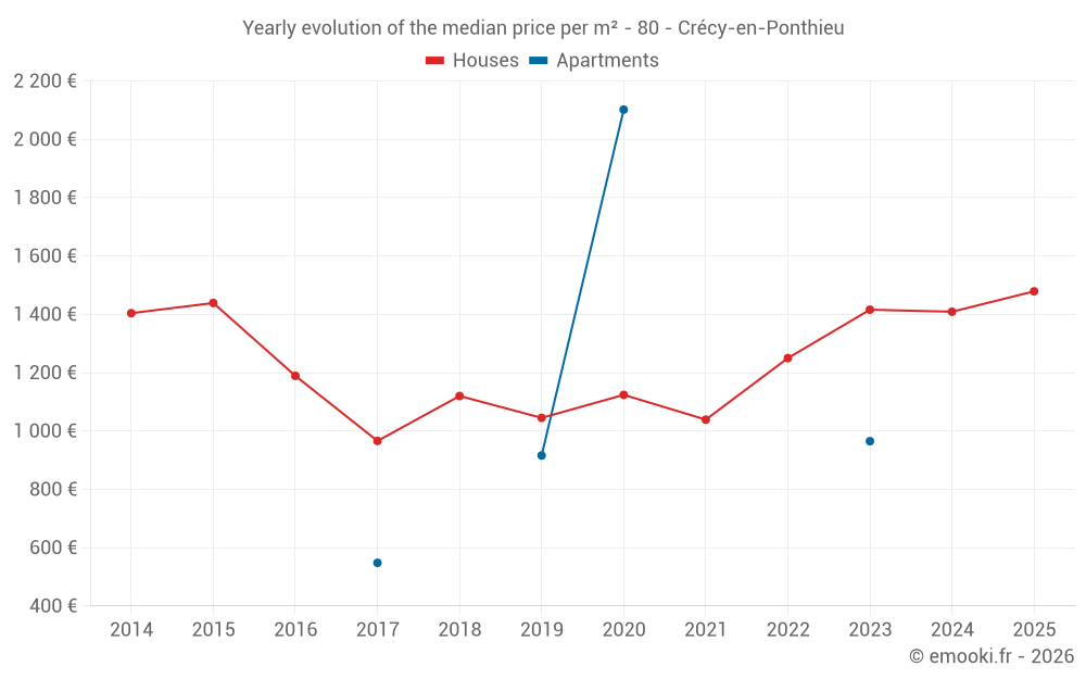 The median price on the 29 house transactions of the last 12 months in the municipality of Crécy-en-Ponthieu was 1 423 € per square meter for a median property value of 130 000 €. Over this period, 60% of transactions were between 765 and 1 621 € per square meter (from the 2nd to the 8th deciles).