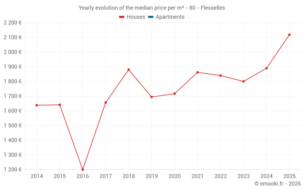 The median price on the 33 house transactions of the last 24 months in the municipality of Flesselles was 1 890 € per square meter for a median property value of 190 000 €. Over this period, 60% of transactions were between 1 640 and 2 481 € per square meter (from the 2nd to the 8th deciles).