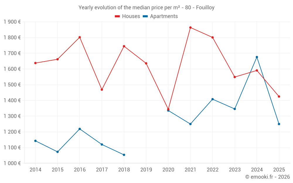 The median price on the 19 house transactions of the last 12 months in the municipality of Fouilloy was 1 591 € per square meter for a median property value of 137 500 €. Over this period, 60% of transactions were between 1 385 and 2 121 € per square meter (from the 2nd to the 8th deciles).