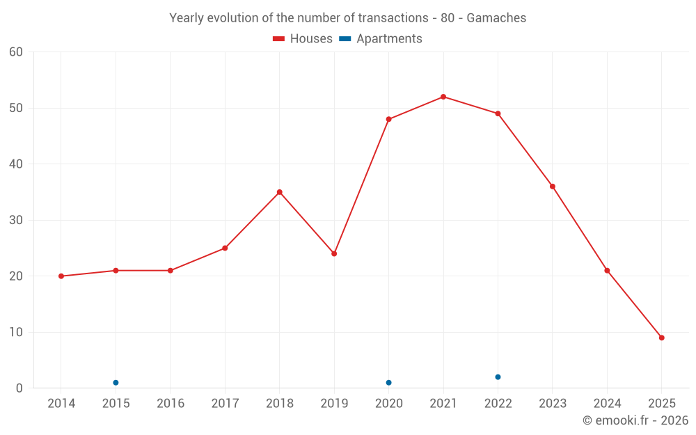 The median price on the 23 house transactions of the last 12 months in the municipality of Gamaches was 1 549 € per square meter for a median property value of 117 250 €. Over this period, 60% of transactions were between 1 014 and 1 847 € per square meter (from the 2nd to the 8th deciles).