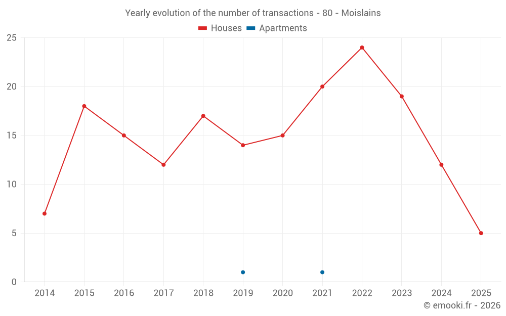 The median price on the 29 house transactions of the last 24 months in the municipality of Moislains was 1 231 € per square meter for a median property value of 88 800 €. Over this period, 60% of transactions were between 728 and 1 686 € per square meter (from the 2nd to the 8th deciles).