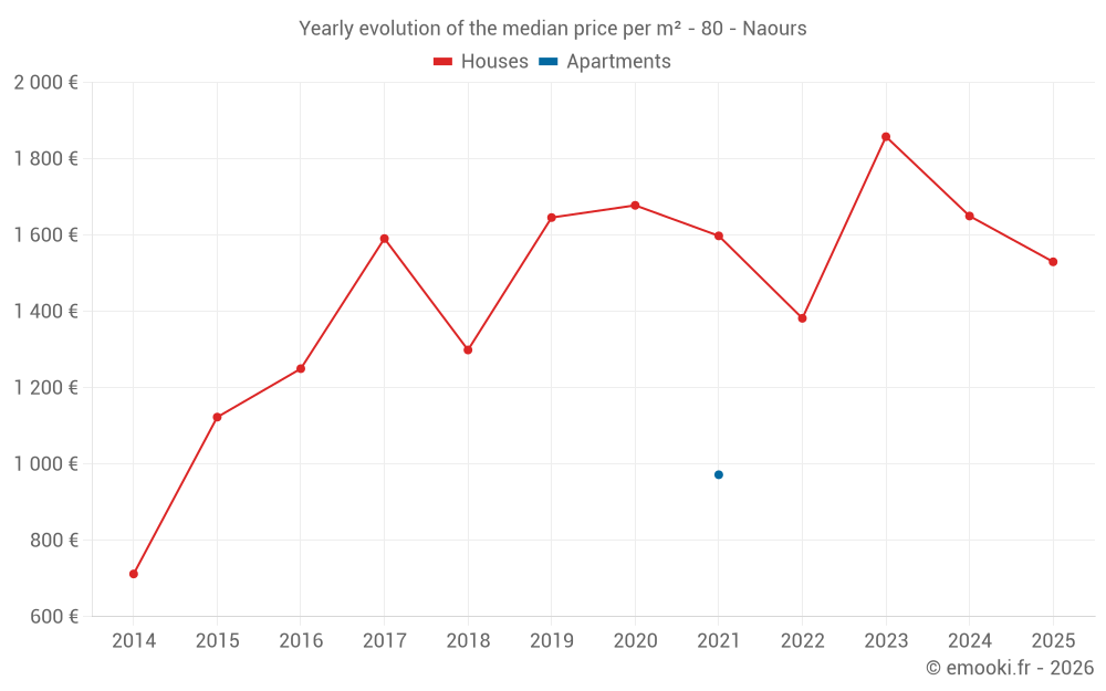 The median price on the 19 house transactions of the last 24 months in the municipality of Naours was 1 667 € per square meter for a median property value of 157 000 €. Over this period, 60% of transactions were between 1 298 and 1 954 € per square meter (from the 2nd to the 8th deciles).