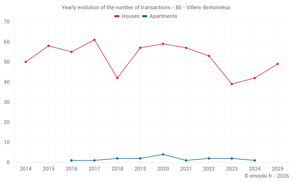 The median price on the 26 house transactions of the last 6 months in the municipality of Villers-Bretonneux was 1 990 € per square meter for a median property value of 187 875 €. Over this period, 60% of transactions were between 1 509 and 2 556 € per square meter (from the 2nd to the 8th deciles).