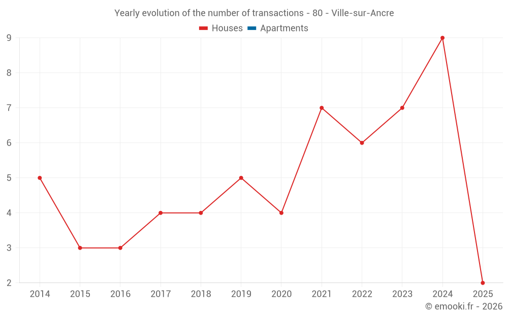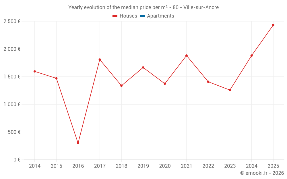 The median price on the 16 house transactions of the last 24 months in the municipality of Ville-sur-Ancre was 1 861 € per square meter for a median property value of 106 880 €. Over this period, 60% of transactions were between 1 190 and 2 826 € per square meter (from the 2nd to the 8th deciles).