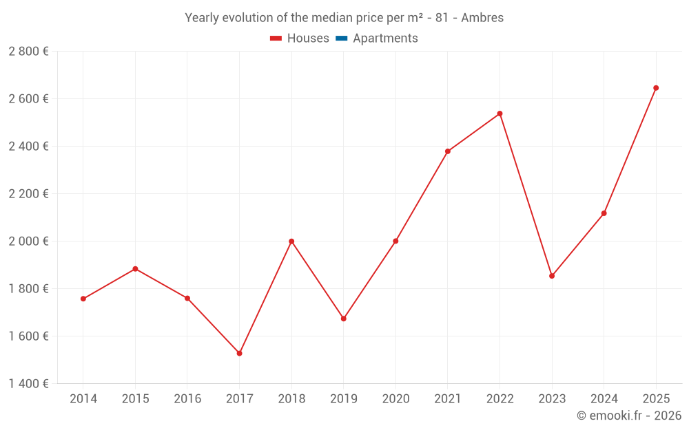 The median price on the 16 house transactions of the last 24 months in the municipality of Ambres was 2 255 € per square meter for a median property value of 247 945 €. Over this period, 60% of transactions were between 1 643 and 2 637 € per square meter (from the 2nd to the 8th deciles).