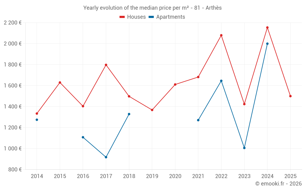 The median price on the 16 house transactions of the last 12 months in the municipality of Arthès was 1 524 € per square meter for a median property value of 145 000 €. Over this period, 60% of transactions were between 1 000 and 2 171 € per square meter (from the 2nd to the 8th deciles).
