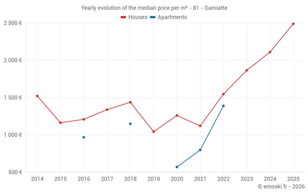 The median price on the 18 house transactions of the last 24 months in the municipality of Damiatte was 2 068 € per square meter for a median property value of 198 950 €. Over this period, 60% of transactions were between 1 571 and 2 554 € per square meter (from the 2nd to the 8th deciles).