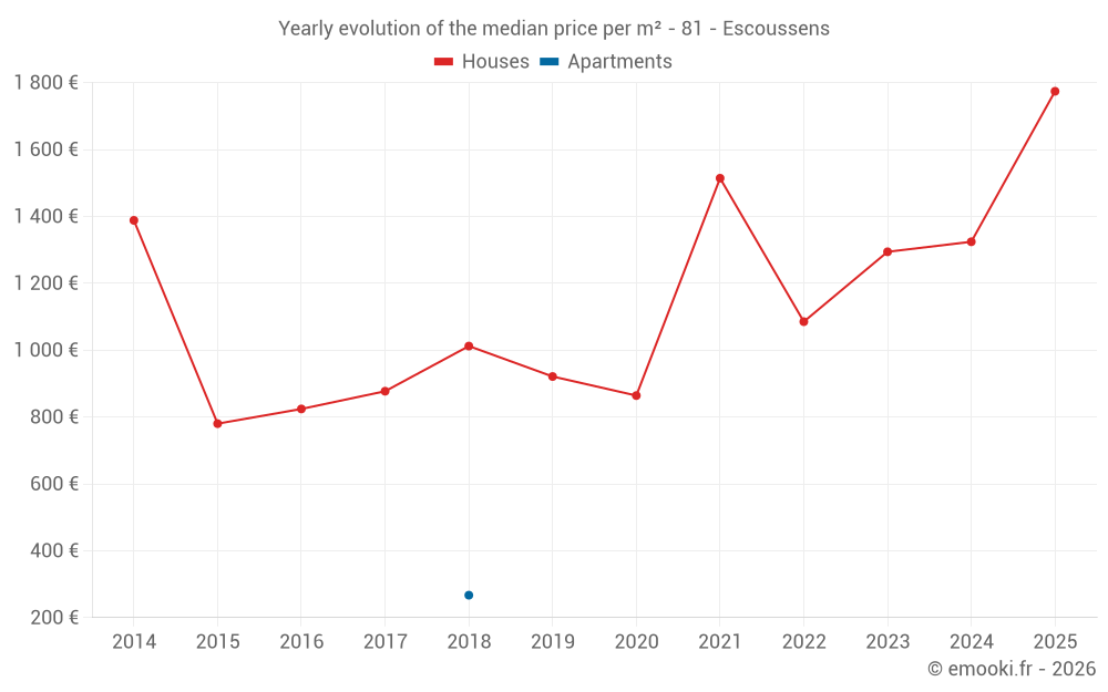 The median price on the 14 house transactions of the last 24 months in the municipality of Escoussens was 1 511 € per square meter for a median property value of 141 740 €. Over this period, 60% of transactions were between 983 and 1 835 € per square meter (from the 2nd to the 8th deciles).