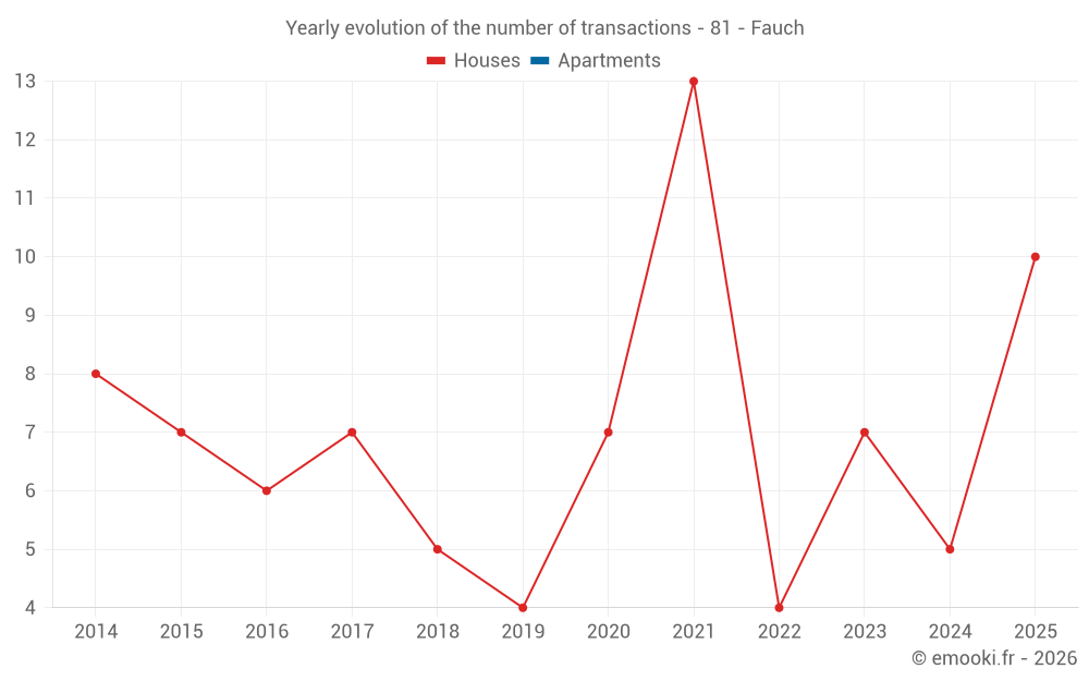 The median price on the 15 house transactions of the last 24 months in the municipality of Fauch was 2 088 € per square meter for a median property value of 208 800 €. Over this period, 60% of transactions were between 1 381 and 2 342 € per square meter (from the 2nd to the 8th deciles).