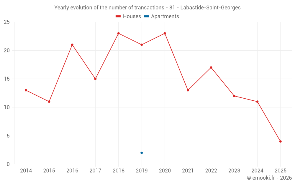 The median price on the 21 house transactions of the last 24 months in the municipality of Labastide-Saint-Georges was 2 386 € per square meter for a median property value of 279 000 €. Over this period, 60% of transactions were between 1 975 and 2 819 € per square meter (from the 2nd to the 8th deciles).