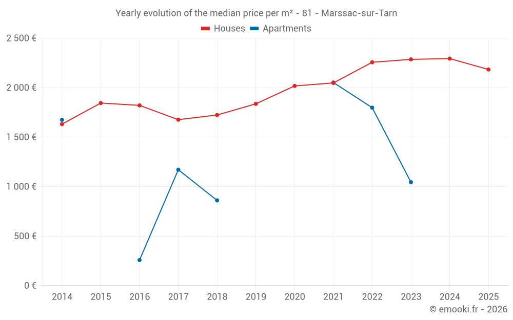 The median price on the 29 house transactions of the last 12 months in the municipality of Marssac-sur-Tarn was 2 268 € per square meter for a median property value of 225 000 €. Over this period, 60% of transactions were between 2 020 and 2 822 € per square meter (from the 2nd to the 8th deciles).