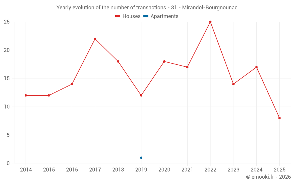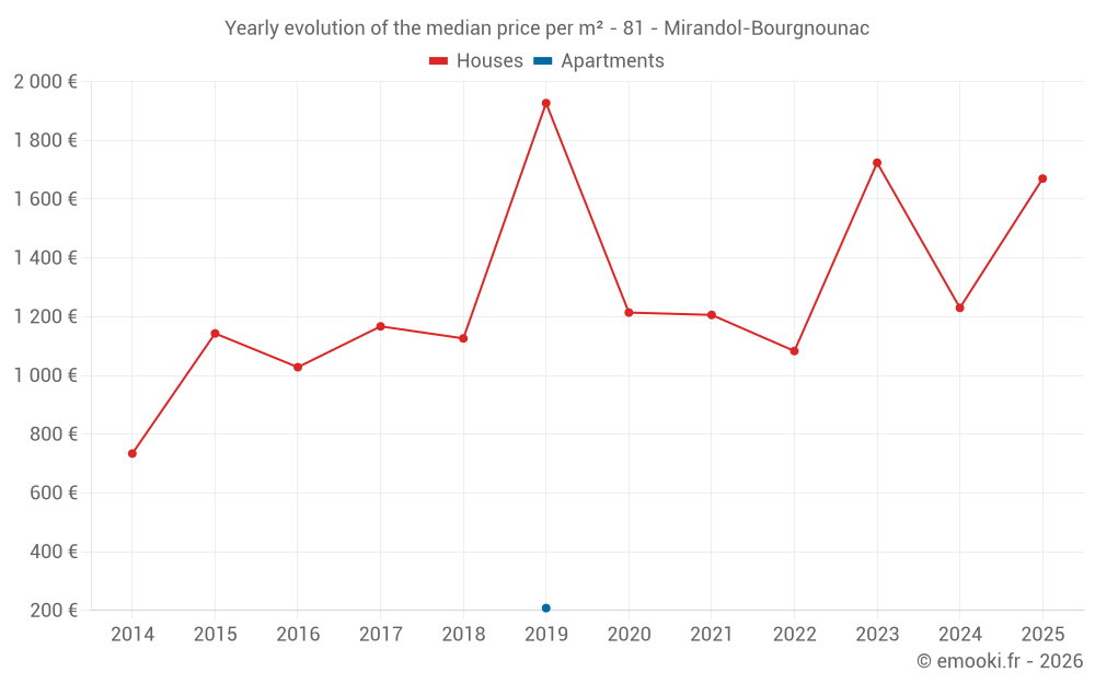 The median price on the 31 house transactions of the last 24 months in the municipality of Mirandol-Bourgnounac was 1 418 € per square meter for a median property value of 147 650 €. Over this period, 60% of transactions were between 794 and 1 957 € per square meter (from the 2nd to the 8th deciles).