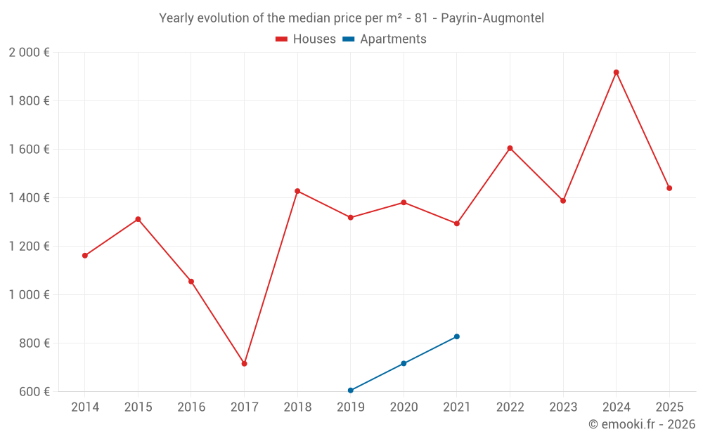 The median price on the 21 house transactions of the last 12 months in the municipality of Payrin-Augmontel was 1 440 € per square meter for a median property value of 148 347 €. Over this period, 60% of transactions were between 839 and 1 923 € per square meter (from the 2nd to the 8th deciles).