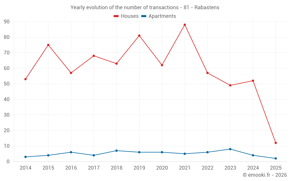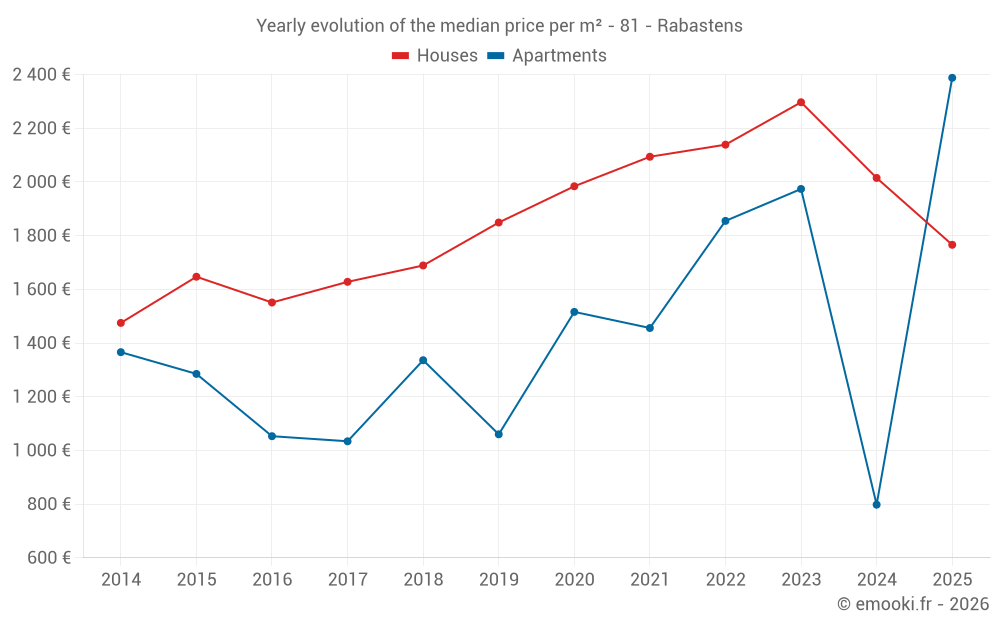 The median price on the 41 house transactions of the last 12 months in the municipality of Rabastens was 1 974 € per square meter for a median property value of 210 000 €. Over this period, 60% of transactions were between 1 348 and 2 654 € per square meter (from the 2nd to the 8th deciles).