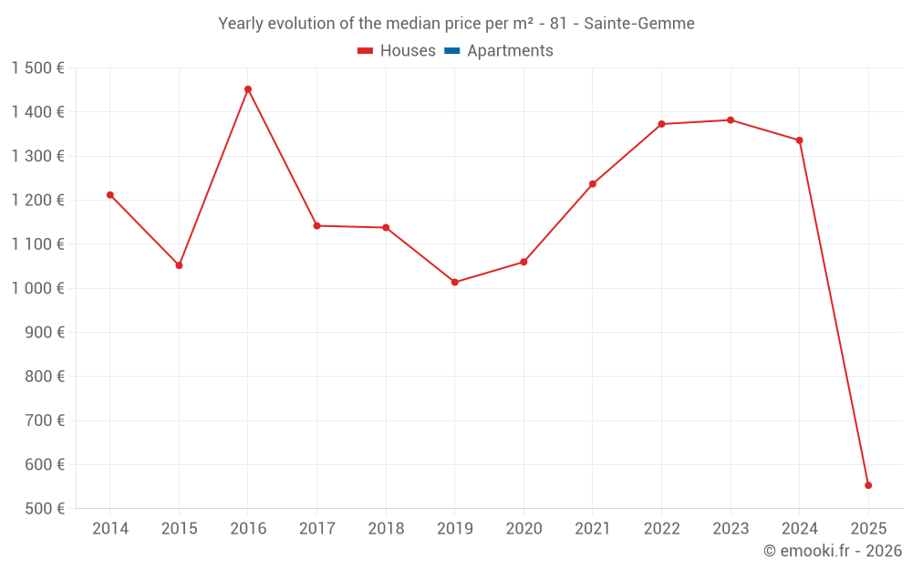 The median price on the 16 house transactions of the last 24 months in the municipality of Sainte-Gemme was 1 113 € per square meter for a median property value of 114 000 €. Over this period, 60% of transactions were between 718 and 1 727 € per square meter (from the 2nd to the 8th deciles).