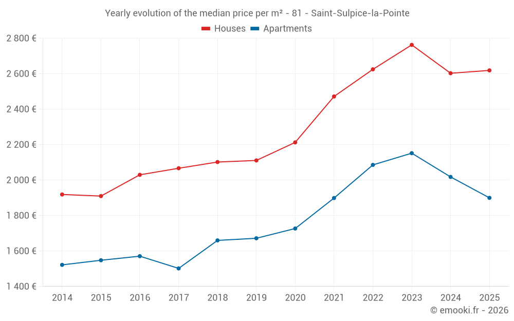 The median price on the 25 house transactions of the last 6 months in the municipality of Saint-Sulpice-la-Pointe was 2 619 € per square meter for a median property value of 205 000 €. Over this period, 60% of transactions were between 2 276 and 2 924 € per square meter (from the 2nd to the 8th deciles).