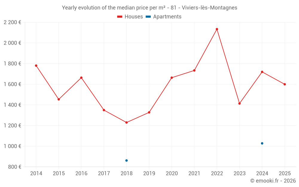 The median price on the 23 house transactions of the last 24 months in the municipality of Viviers-lès-Montagnes was 1 500 € per square meter for a median property value of 180 000 €. Over this period, 60% of transactions were between 895 and 1 806 € per square meter (from the 2nd to the 8th deciles).