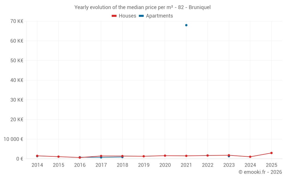 The median price on the 14 house transactions of the last 24 months in the municipality of Bruniquel was 1 246 € per square meter for a median property value of 189 275 €. Over this period, 60% of transactions were between 602 and 2 173 € per square meter (from the 2nd to the 8th deciles).