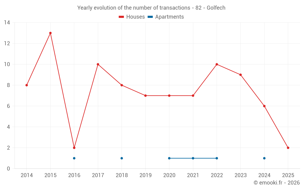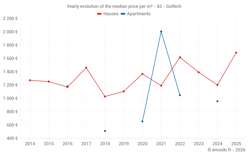 The median price on the 14 house transactions of the last 24 months in the municipality of Golfech was 1 450 € per square meter for a median property value of 163 000 €. Over this period, 60% of transactions were between 1 089 and 1 876 € per square meter (from the 2nd to the 8th deciles).