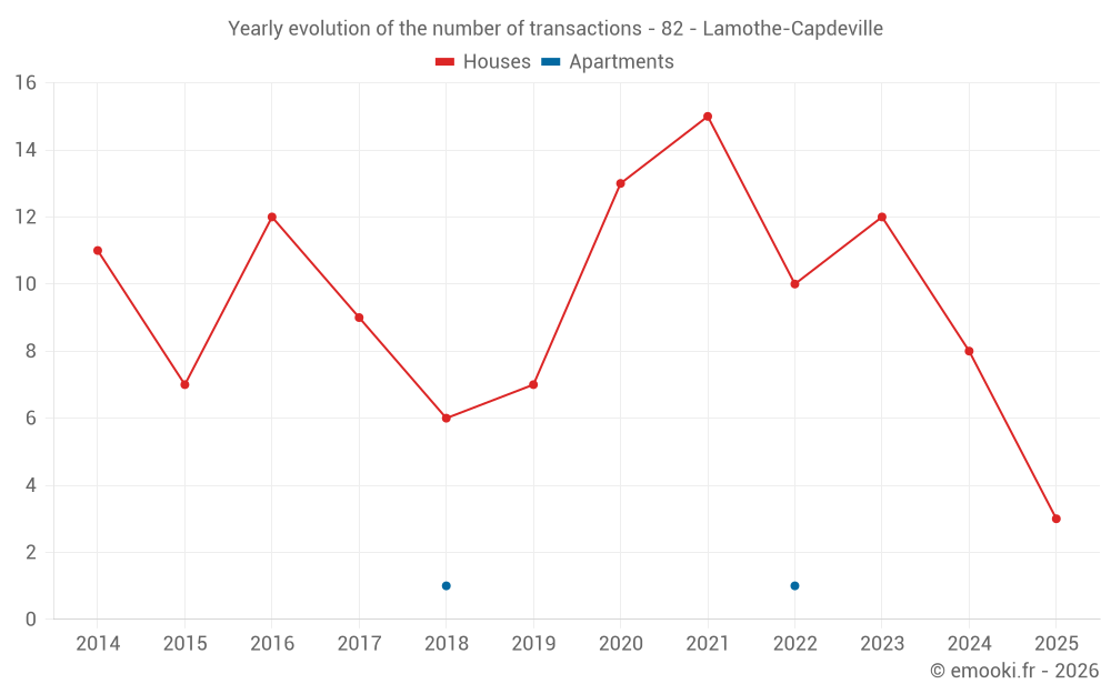 The median price on the 16 house transactions of the last 24 months in the municipality of Lamothe-Capdeville was 1 662 € per square meter for a median property value of 140 000 €. Over this period, 60% of transactions were between 1 040 and 2 452 € per square meter (from the 2nd to the 8th deciles).