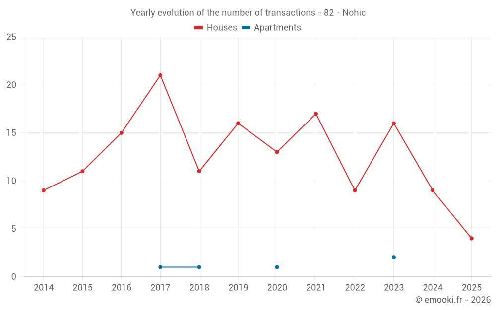 The median price on the 21 house transactions of the last 24 months in the municipality of Nohic was 2 419 € per square meter for a median property value of 233 000 €. Over this period, 60% of transactions were between 1 848 and 2 778 € per square meter (from the 2nd to the 8th deciles).
