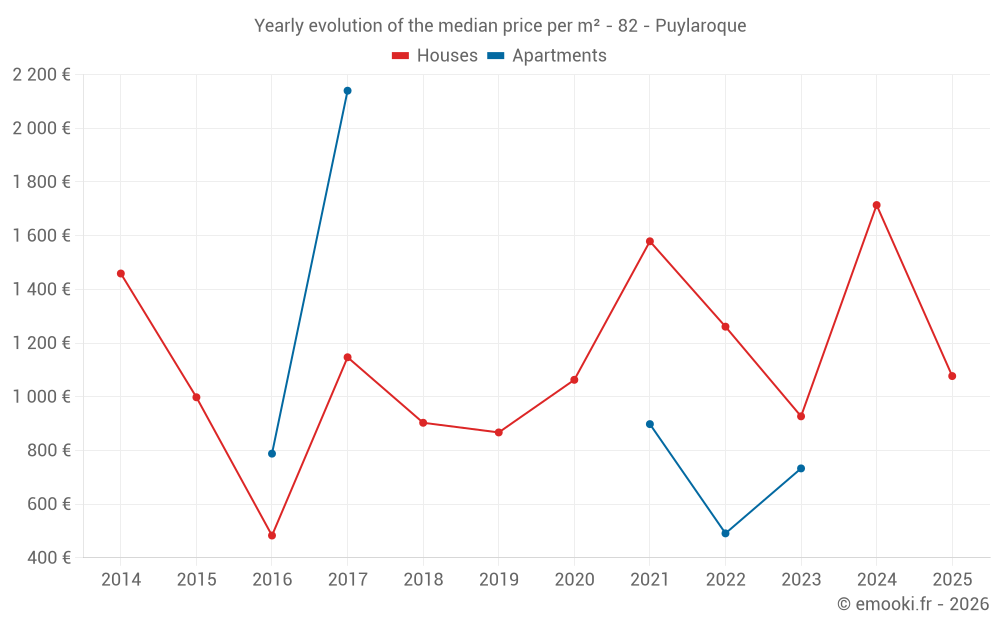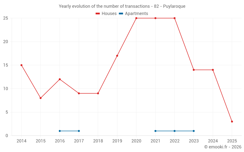 The median price on the 25 house transactions of the last 24 months in the municipality of Puylaroque was 1 596 € per square meter for a median property value of 132 000 €. Over this period, 60% of transactions were between 887 and 2 005 € per square meter (from the 2nd to the 8th deciles).