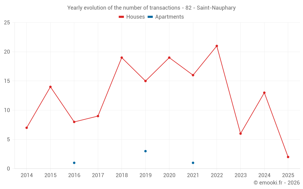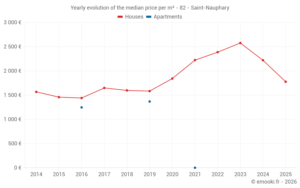 The median price on the 18 house transactions of the last 24 months in the municipality of Saint-Nauphary was 2 213 € per square meter for a median property value of 272 045 €. Over this period, 60% of transactions were between 1 938 and 2 690 € per square meter (from the 2nd to the 8th deciles).