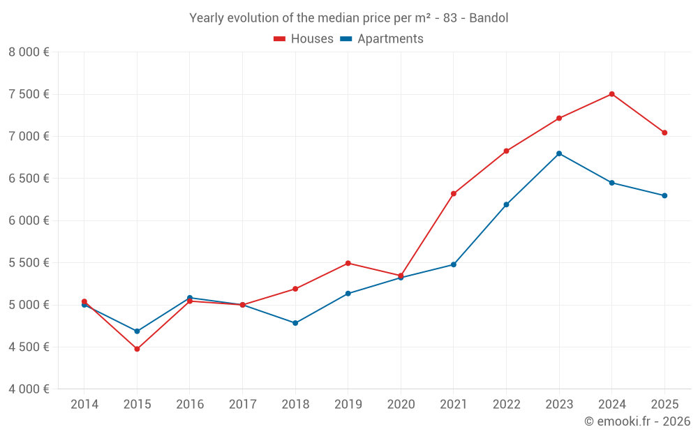 The median price on the 31 house transactions of the last 6 months in the municipality of Bandol was 7 043 € per square meter for a median property value of 885 000 €. Over this period, 60% of transactions were between 5 455 and 9 048 € per square meter (from the 2nd to the 8th deciles).