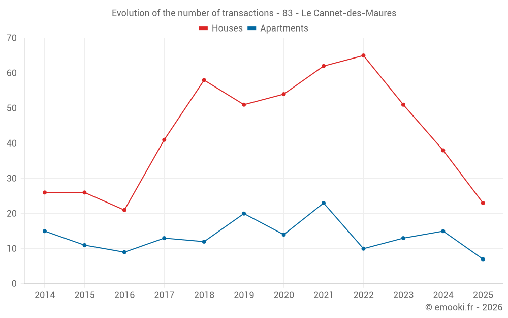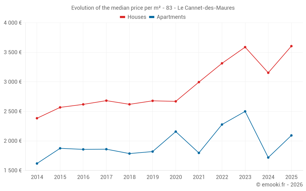 The median price on the 23 house transactions of the last 6 months in the municipality of Le Cannet-des-Maures was 3 605 € per square meter for a median property value of 319 000 €. Over this period, 60% of transactions were between 3 064 and 4 096 € per square meter (from the 2nd to the 8th deciles).