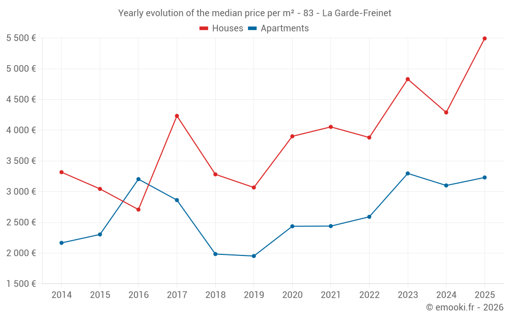 The median price on the 19 house transactions of the last 6 months in the municipality of La Garde-Freinet was 5 492 € per square meter for a median property value of 690 000 €. Over this period, 60% of transactions were between 2 927 and 6 281 € per square meter (from the 2nd to the 8th deciles).